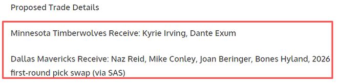 美媒《Scoop B》的记者布兰登罗宾逊报道称,联盟内部的高管普遍认为,欧文是森林狼最佳的夺冠拼图,两队有望在交易截止日前达成关于欧文的交易。一边是连续两年止步西决、急需冠军拼图的森林狼,一边是战绩垫底、核心阵容处境尴尬的独行侠,该媒体也晒出一套5换2的交易方案,引发外界的热议。森林狼送出纳兹·里德、迈克·康利、若昂·贝兰热、海兰德外加2026年首轮选秀权互换权,从独行侠得到凯里·欧文和丹特·埃克萨姆。这波操作要是真能成,不仅会重塑西部格局,对两队的未来更是影响深远。
